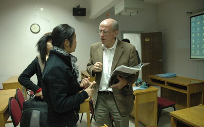 晚上6:20分,拉夫堡大学国际部主任Tony Westaway 先生在培训楼307教室,为意向去该校的学校全日制本科生、硕士研究生和博士生做了一场生动的说明会,介绍了拉夫堡大学的基本情况,会后还对部分学生进行了面试,就学生关心的问题进行了一一解答。