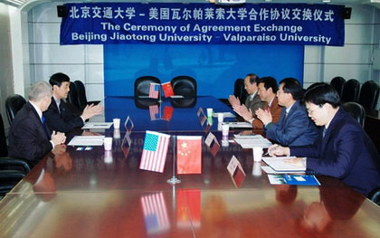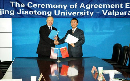 北京交通大学与美国瓦尔帕莱索大学研究生课程合作协议和研究生招生合作协议是于2008年7月签署的。根据协议,该项目面向大四在校学生和大专毕业生。大四学生在交大完成1—3门瓦大课程;大专毕业生在交大完成3门课程、在瓦大完成7门课程,即可以免托福、GRE直接被瓦大研究生院录取,成为硕士研究生。完成学业即可获得硕士学位。赴美签证由北京交大留学服务中心统一办理。该项目瓦大已向美国大使馆备案,为该项目的中国学生办理赴美留学签证提供保*,为国内大本、大专学生留美读研开辟了特别通道。