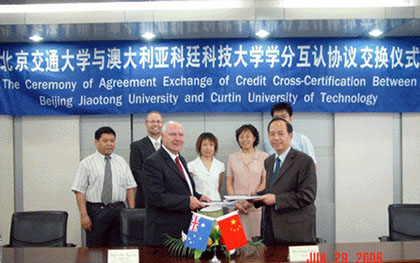 6月29日在北京交通大学思源楼,科廷科技大学商学院国际部主任理查得•诺瓦克、中国项目主管加瑞•芮沃斯博士,北京交通大学远程与继续教育学院院长陈庚,北京交大留学服务中心主任于和平出席了交换仪式。根据《中华人民共和国中外合作办学条例》关于"国家鼓励在高等教育、职业教育领域开展中外合作办学"的精神,北京交通大学加强与国外知名大学的交流与合作,致力于培养国际型复合人才。多年来,我校先后与美、英、德、法、比、澳、加、荷、日、韩等国家和地区的40多所国际知名大学建立了合作关系。在校际合作与交流的基础上,北京交大与澳大利亚科廷科技大学就全面开展本科阶段互认学分学历项目达成合作协议。该项目主要是双方互认学生前两年所修本科专业基础课程学分。同时学生在第三年可自由选择专业。该项目为中国学生提供了经济、便捷、灵活的出国留学机会,他们在北京交大修完两年国际预科和专业基础课程,就可以获得科廷科技大学承认的一年学分,雅思成绩达到6.0 ,即可留学澳大利亚科廷科技大学,直接就读科廷本科*后两年的课程,完成学业获得科廷科技大学学位,并可继续攻读硕士学位。位于西澳*府佩斯的科廷科技大学创建于1967年,是澳大利亚著名的综合性大学之一,在澳大利亚理工类大学中排名*位。今年四月温家宝总理访问澳大利亚期间拜访了该校。科廷科技大学商学院是澳大利亚*大的、*具创新精神的商学院之一。课程设置灵活,与多变的商业形式保持同步。据悉,北京交大2006年*招的该项目的中国学生,就是为科廷科技大学商学院定向培养的商科方向留学生。他们在第三年可以自由选择科廷科技大学商学院除法律以外的所有专业,包括会计,经济与金融,信息系统,管理和市场营消等。