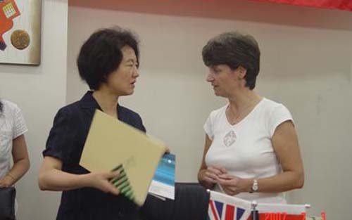 包华影院长与英国苏格兰学历管理委员会国际项目部经理Lynda Lamont女士亲密交谈