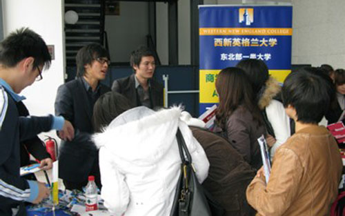 活动现场热闹非凡,08级毕业班的学生们为了尽早的掌握2010年的留学信息积极的参与了本次活动。除了毕业班的学生外,09、10级的同学们也纷纷前来参加展会,他们想提前了解国外院校的学习环境、入学要求、地理位置等国外大学的信息。相比之下,08级的学生则更侧重奖学金申请政策、教师授课情况、中国学生所占比率、学费等方面的信息。国外大学的代表们针对同学们提出的问题给予耐心细致的解答,同学们也都仔细的聆听大学老师的讲解,整个活动现场气氛和谐融洽。