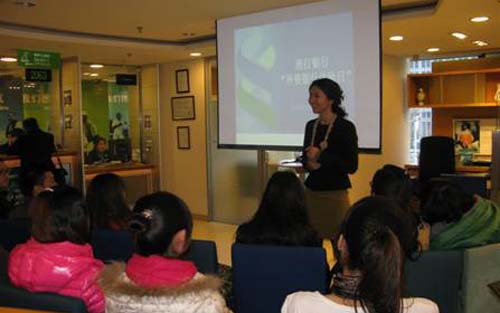 渣打银行负责培训的李铣女士充分调动起同学们的积极性,他询问大家将来的就业方向,她向那些未来金融界的“同行”问好,大家一下子被她逗乐了。她告诉大家 渣打银行英文名字的由来,“Standard Chartered Bank ”是在维多利亚女皇的特许(即“渣打”这个字的英文原义)下于1853年建立的,渣打银行在发展家的银行中拥有地位,在全球拥有1400多家分支 机构,遍布世界56个国家,是早在设立分行的外资银行之一(1858年),并且从未中断过在大陆的业务运营。她为大家讲解了银行的组织构成,包 括集体架构和支行架构等。渣打银行的社会责任是“Seeing is believing(看得见的希望),Living with HIV(关心艾滋行动)”,在悠久的历史中形成了自己独特的企业价值观,不仅致力于为世界提供更好的金融服务,也以其人道主义理念承担着企业的社会责任。
