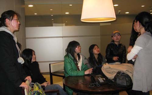 渣打银行的服务群体主要是中高层客户,因此其内部环境设置得高贵雅致,主色调是柔和的暖色调,黄色的桌椅、淡绿色的宣传海报、白色的百合以及微黄的光晕令 整个工作环境显得分外舒适。热情的服务人员为大家在包厢里准备了浓郁的咖啡和清香的茶水,美丽的支行行长欢迎大家的到来,希望同学们此行愉快。