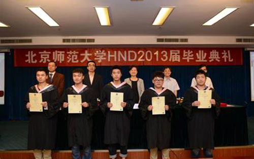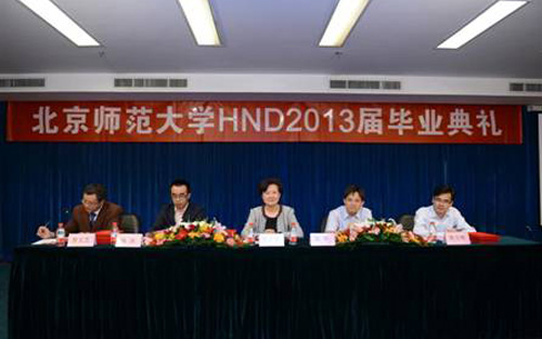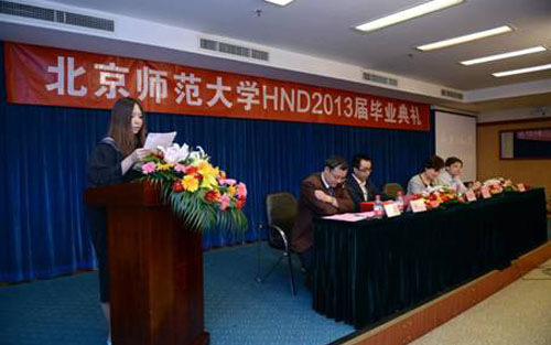 5月28日上午十点,北师大2013届HND毕业生典礼在京师大厦隆重拉开序幕,此次典礼由北师大继续教育与教师培训学院副院长曾文艺主持,到场的领导有北师大继教院院长包华影,副院长韩冰、黄文峰,副书记张林、HND中心主任卓举纲等学院领导,另外,HND中心的各位老师及部分毕业生家长也前来参加了这次隆重的毕业典礼。
