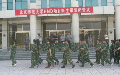 9月21日下午1点,北京师范大学HND项目2013级新生军训闭营仪式暨成果汇报演出在部队训练操场上隆重举行。出席此次大会的有北京师范大学继续教育与教师培训学院副院长曾文艺、北师大HND项目中心主任卓举纲、学管部主任李伟群、部队领导、2013级各班班主任以及全体军训教官和2013级全体同学。