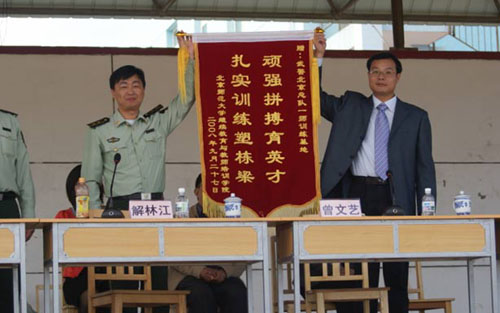 接着,北京武警*一师训练基地解林江主任发表了讲话,他对同学们军训取得的优异成绩表示祝贺,希望同学们一定要把军训中学到的好思想、好传统、好作风自觉 地融入到大学生活中,并加以发扬光大,信心百倍地去迎接新生活的挑战,要志存高远,勤奋学习,为我们国家的中华民族建功立业。