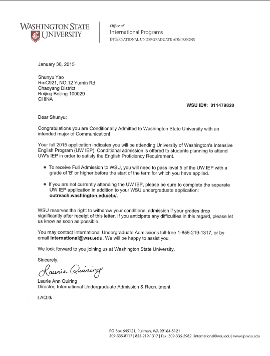 恭喜姚同学获得美国华盛顿州立大学大众传媒专业的录取通知书!
