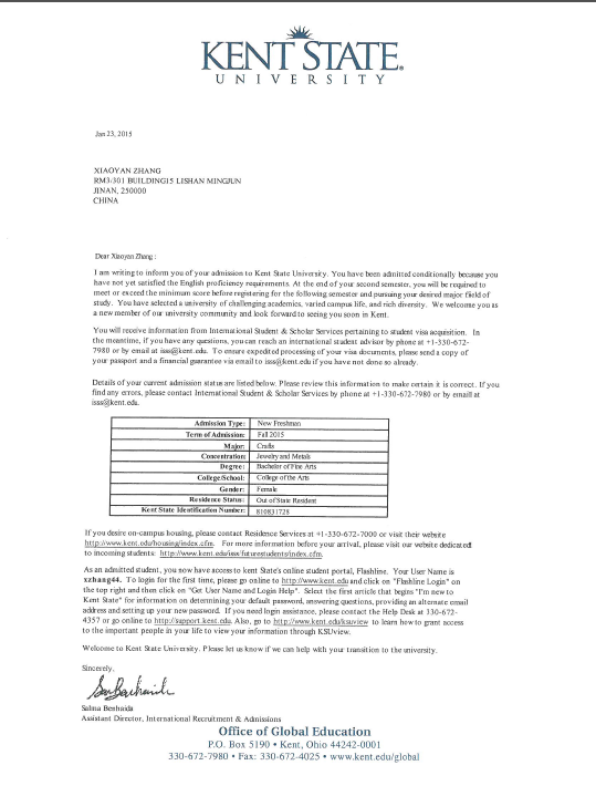 恭喜张同学获得美国肯特州立大学珠宝和金属设计专业录取通知书 !