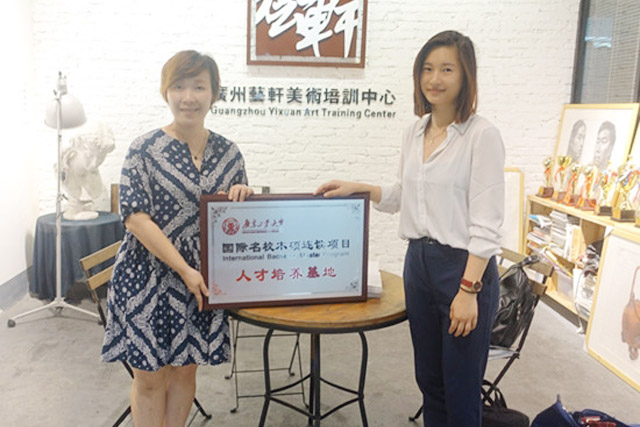 2016年5月18日,广东工业大学IBP项目人才培养基地授牌仪式在广州艺轩画室举行,IBP项目招生办李老师向艺轩画室李校长授予“人才培养基地”牌匾。