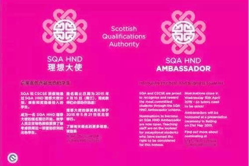 自2003年中国(教育*)留学服务中心引进SQA-HND项目以来,每年都会大批的优秀学生在自己的专业领域取得可喜的成绩,每年也有大批的中国HND学子赴英完成学业。2015年,SQA设立理想大使这一奖项,以表彰优秀HND学生的付出和努力。SQA理想大使这一称号是对SQA-HND项目*优秀学生的肯定和嘉奖。获奖同学均为成绩优异,校园活动积极,能力表现突出,勇于挑战自我,超越自我的学生。