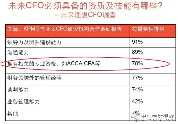 我们刚刚分析了大的背景,我们现在来分析远的愿景,接下来这张图是来自于KPMG与亚太CFO研究机构合作报告图,指出未来的CFO,也就是我们说的财务管理的领导者,他们必须具备的资质与技能有哪些,除了普遍意义上可能大家都知道的,能够想到的,领导力、团队建设能力、沟通能力之外,排行第三重要的是拥有相关的专业资格,如ACCA、CPA等等。