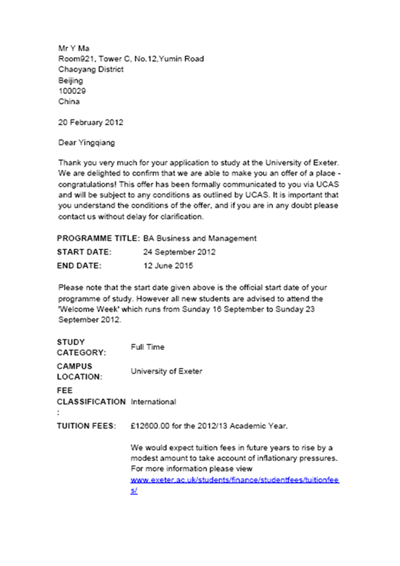 马赢强同学是我项目2008级学生,经过他在对外经贸大学信息学院出国留学预科班一年的学习提升,收获了英国埃克塞特大学的OFFER。
