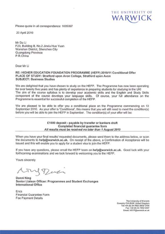 李达同学是我项目2009级学生,经过他在对外经贸大学信息学院出国留学预科班一年的学习提升,收获了英国华威大学的OFFER。