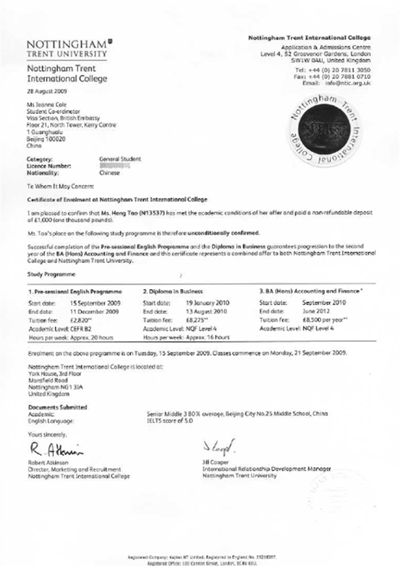 陶姮同学是我项目2008级学生,经过他在对外经贸大学信息学院出国留学预科班一年的学习提升,收获了英国诺丁汉特伦特大学的OFFER。