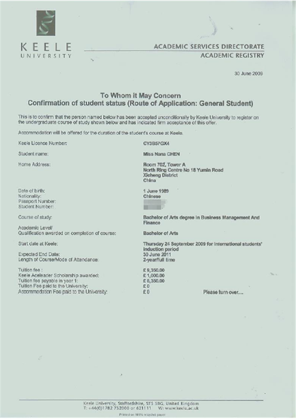 陈娜娜同学是我项目2010级学生,经过他在对外经贸大学信息学院出国留学预科班一年的学习提升,收获了英国基尔大学的OFFER。