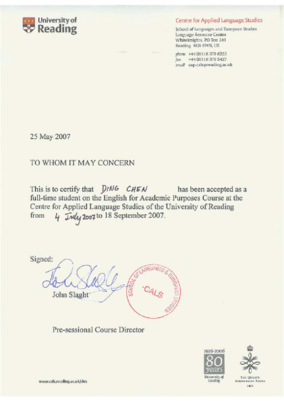 陈丁同学是我项目2006级学生,经过他在对外经贸大学信息学院出国留学预科班一年的学习提升,收获了英国雷丁大学的OFFER。
