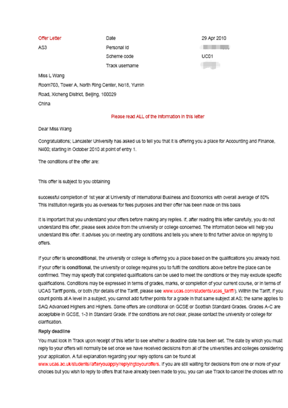 王丽同学是我项目2009级学生,经过他在对外经贸大学信息学院出国留学预科班一年的学习提升,收获了英国兰卡斯特大学的OFFER。