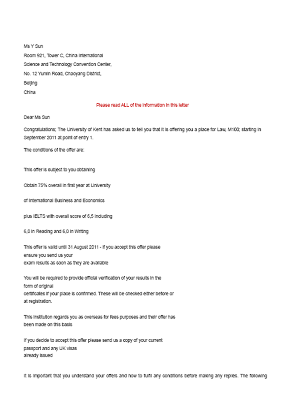 孙雪同学是我项目2010级学生,经过他在对外经贸大学信息学院出国留学预科班一年的学习提升,收获了英国肯特大学的OFFER。
