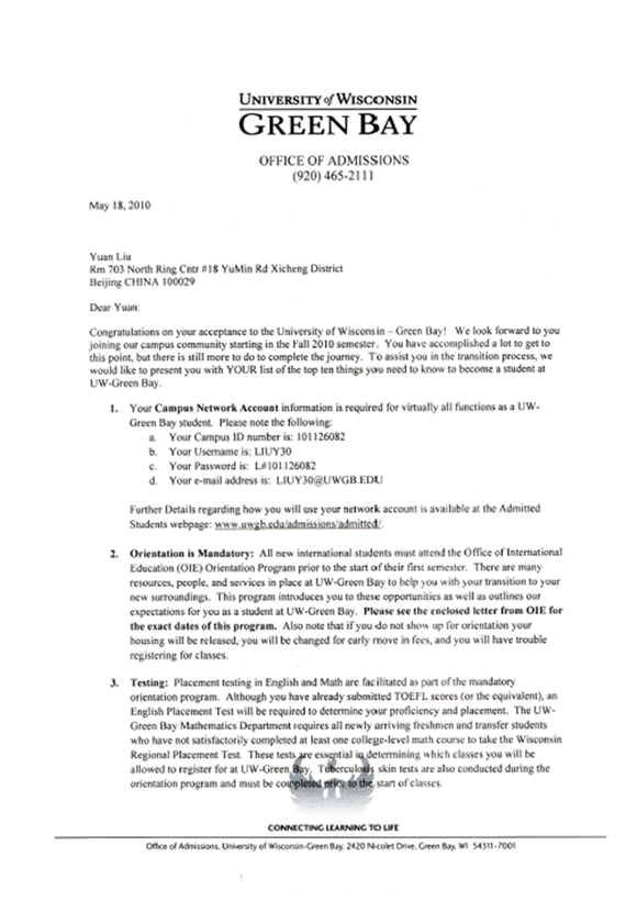 刘源同学是我项目2009级学生,在贸大信息学院IAC国际课程班一年的学习提升,获得了美国威斯康星大学绿湾校区的OFFER。