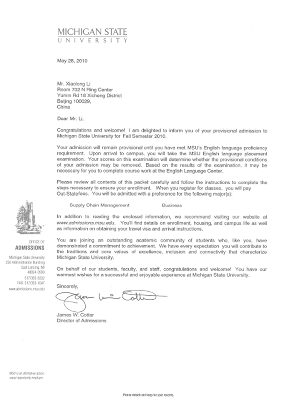 李晓彤同学是我项目2009级学生,在贸大信息学院IAC国际课程班一年的学习提升,获得了美国密西根州立大学的OFFER。   密歇根州立大学成立于1855年,位于密歇根州东兰辛市,是一所高水平的研究性大学。密歇根州立大学被《美国新闻和世界报道》杂志评为全美公立大学第29名,并被《普林斯顿评论》杂志评为中西部*好的大学之一。在2006年,被《Kiplinger》杂志评为*有价值的公立大学前100强。密歇根州立大学不但是以教育/农业/传媒理论闻名,而且音乐治疗也是位于美国先锋地位。密歇根州立大学也拥有全美历史第二悠久的饭店管理学院。   同时密歇根州立大学传媒领域专业排名前四,其中包括国际与多元文化通讯、大众传播、以及人际通讯等。教育学院里的许多系排名已达到全美*一或前十名。其他著名的课程包括:犯罪科学、包装学、政治学等。密歇根州立大学的海外研修课程是全美单一校园大学中规模*大的一个,提供超过六十个国家总计两百多个课程,遍及所有的洲。   录取要求: 雅思要求: 6.5 托福要求: 79   总费用: $50,210     州外学费 $34,980     住宿费 $8,856     其他费用 $6,374
