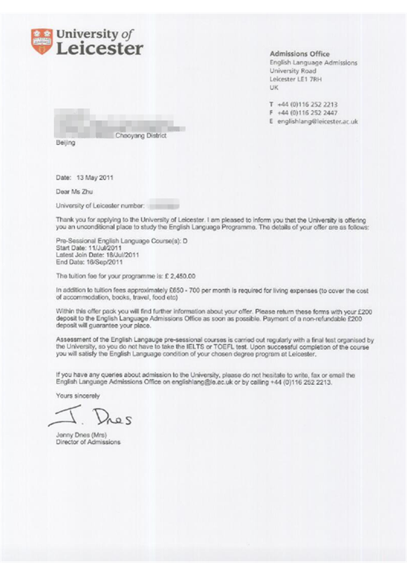 朱倩同学是我项目2013级学生,经过他在对外经贸大学信息学院出国留学预科班一年的学习提升,收获了英国莱斯特大学的OFFER。
