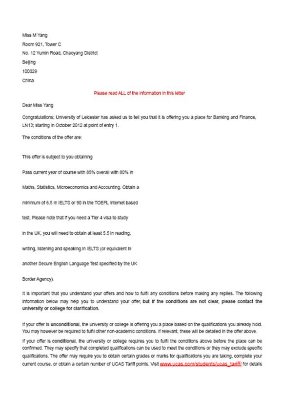 杨梦凡同学是我项目2011级学生,经过他在对外经贸大学信息学院出国留学预科班一年的学习提升,收获了英国莱斯特大学的OFFER。
