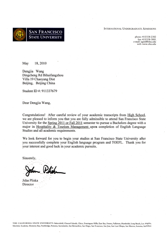 王邓佳同学是我项目2009级学生,经过他在对外经贸大学信息学院出国留学预科班一年的学习提升,收获了美国旧金山州立大学的OFFER。