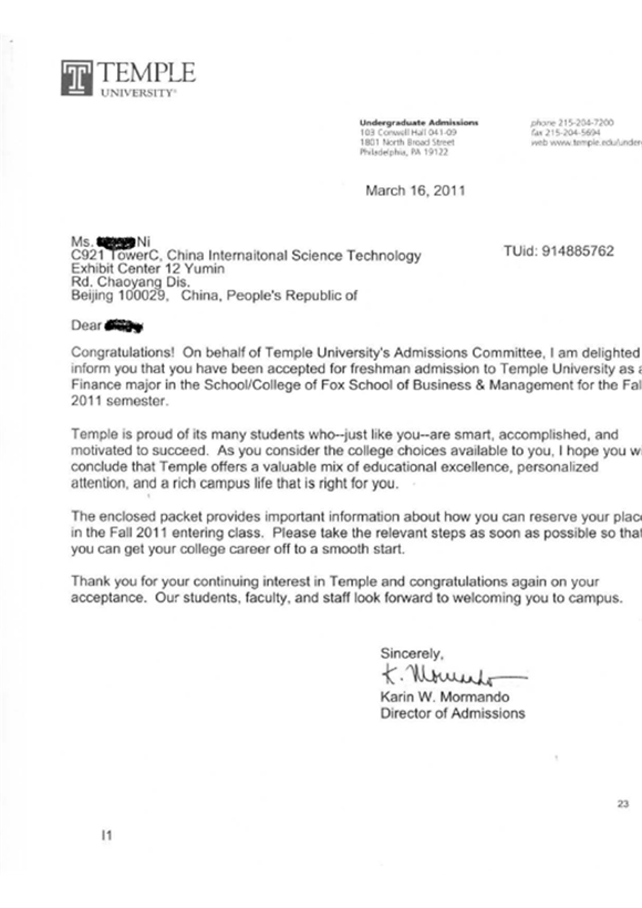 倪邱亮同学是我项目2010级学生,在贸大信息学院IAC国际课程班一年的学习提升,获得了美国高校天普大学的OFFER。