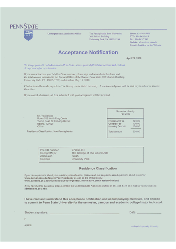 毛友佳同学是我项目2009级学生,在贸大信息学院IAC国际课程班一年的学习提升,获得了美国宾州州立大学的OFFER。