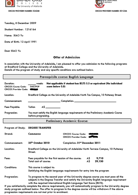 萧雨同学是我项目2008级学生,经过他在对外经贸大学信息学院出国留学预科班一年的学习提升,收获了澳洲阿德莱德大学的OFFER。