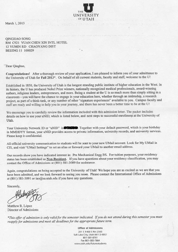 宋卿豪同学是我项目2012级学生,经过他在对外经贸大学信息学院国际课程班一年的刻苦努力,收获了美国犹他大学OFFER。