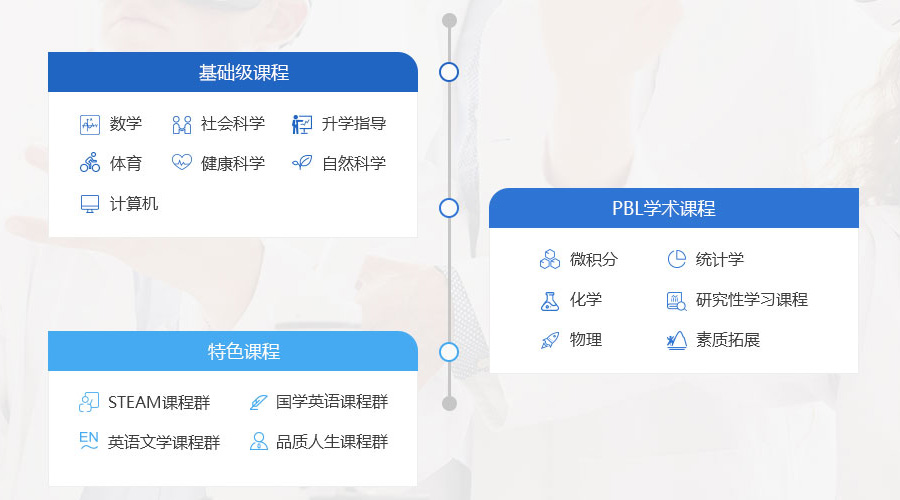 以STEAM为特色,导入美国加州知名蓝带学校的Pathway/ gateway课程、学术研究课程等,融入丰富的国际化社会实践及研学课程,配合持续的留学规划辅导,分为以下三个层次: