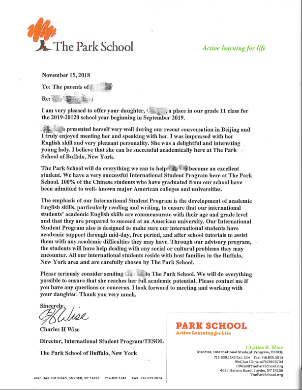 日前,我校学生高雅、桑赫和王熙臻三位同学顺利通过校长团的面试和层层筛选,成功收到美国水牛城帕克学校(The Park School of Buffalo)的预录取通知书,其中高雅同学已收到该校发放的正式录取通知书。在此,向三位同学表示热烈的祝贺!