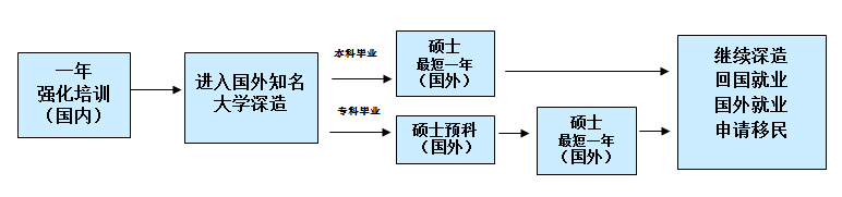 该项目旨在通过对学生的“前期培训”—“中期指导”—“后期输送”,为其与国外知名大学的无缝对接提供一个安全出国留学平台和渠道。希望出国深造但语言或专业基础薄弱的本、专科毕业生通过在国内一年的外语培训、专业知识、案例分析、学术论文撰写等强化学习,成绩达到国外院校的入学标准,除获得国内大学颁发的预科课程结业证书外,可直接申请进入英国、美国、澳大利亚、新西兰及马来西亚等国家名校攻读硕士课程且获得硕士学位。