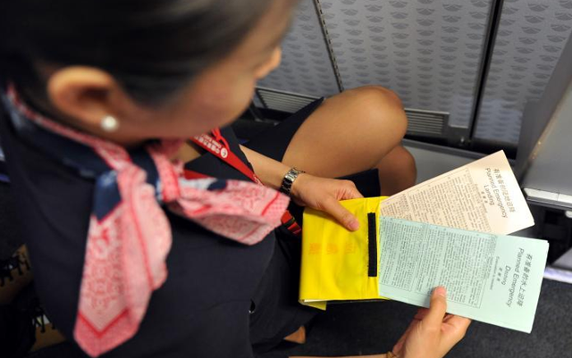 登机后乘务员抓紧时间认真履行着航前准备的所有程序,一丝不苟地检查飞机上的应急设备和服务设备。尤其是航前准备,更事关着航班服务工作的顺利进行。图为空乘员在检查应急资料袋。