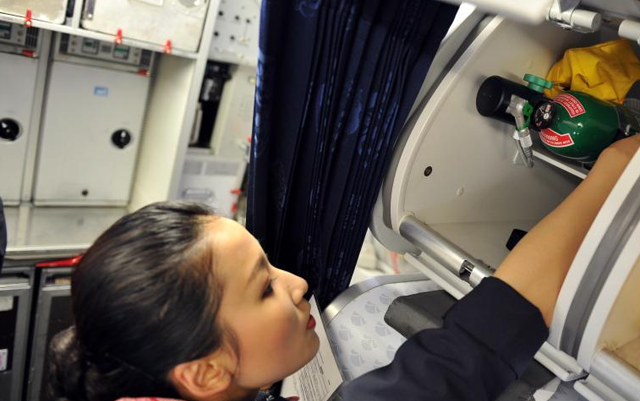 在客舱内,空乘员在检查氧气瓶、救生包等各项应急设备。
