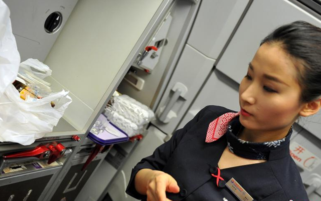 图为在客舱内,空乘员在检查灭火器等应急设备。
