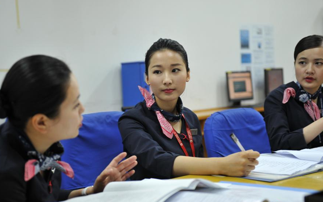 航前准备会是乘务组在飞行前重要的一道准备程序。图为乘务长向乘务组成员通报了本次航班任务的具体情况、注意事项、人员分工,并强调了安全措施。