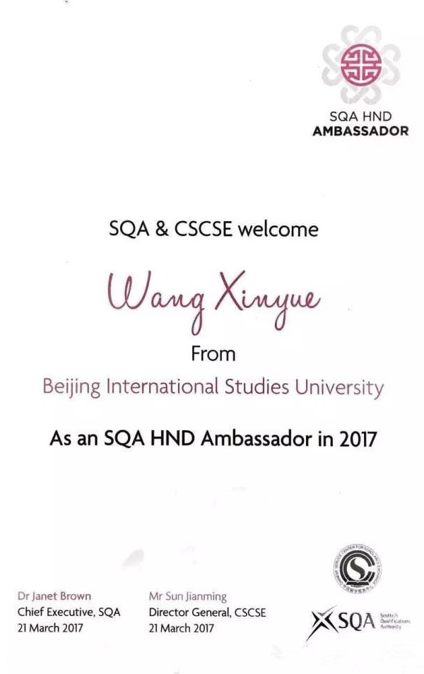 2017年英国苏格兰学历管理委员会从中国30多所承办HND项目的院校中评选出一批优良的项目学生担任"理想大使"一职。SQA"理想大使"作为项目的优良学生代表,将会向社会各界展示SQA-HND的教学理念,质量标准以及社会责任等。