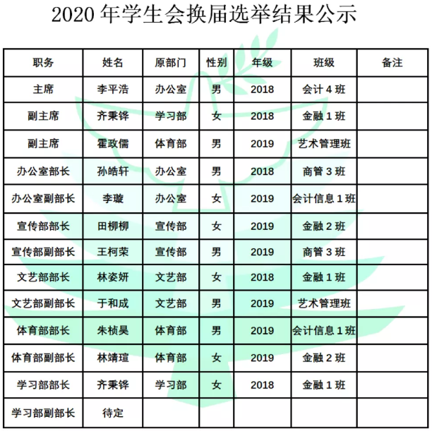 本着公平、公正、公开的原则,通过推荐、演讲、投票、上报、审核等层层筛选,*终11名同学脱颖而出,成为了新一届学生会干部团队成员。