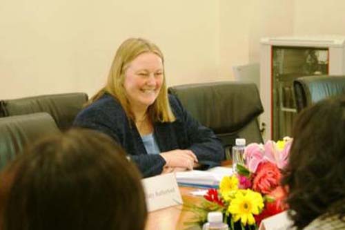 图:Barbara Irvine女士与教学部人员交流