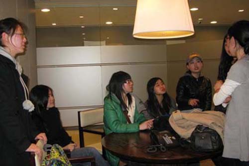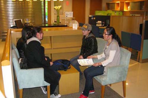 渣打银行的服务群体主要是中高层客户,因此其内部环境设置得高贵雅致,主色调是柔和的暖色调,黄色的桌椅、淡绿色的宣传海报、白色的百合以及微黄的光晕令 整个工作环境显得分外舒适。热情的服务人员为大家在包厢里准备了浓郁的咖啡和清香的茶水,美丽的支行行长欢迎大家的到来,希望同学们此行愉快。