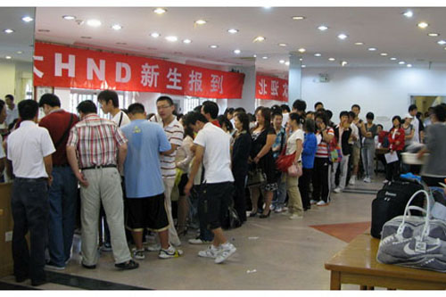 9月20日是我院英国高等教育文凭(HND)项目(以下简称HND项目)2008级新生报到的日子。早在几天前,就已经有很多新生和家长陆续赶来报到。这次新生报到安排在学校兰蕙留学生公寓二楼南侧大厅。学院在9月初就对HND项目新生接待工作进行了全面部署,召开专门会议进行组织和协调,抽调并安排了 30多位老师和工作人员为新生及家长提供全方位的服务,确保了新生接待工作的顺利进行,获得了学生和家长的一致好评。