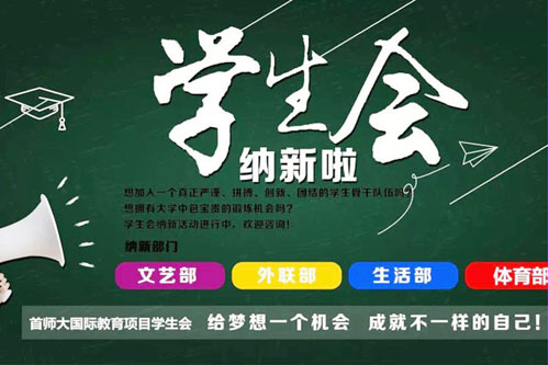 首师大国际教育项目学生会由国际教育项目中心批准成立的学生组织,拥有主*团、外联部、组织部、宣传部、文艺部、体育部、学习部、生活部等八个部门。学生会每年十月举行换届选举。自创建以来,以不变的宗旨服务于全体国际教育项目同学,以灵活的形式使同学们的课余生活丰富多彩。学生会多次成功举办了运动会、新年晚会、演讲比赛、英语角、各式球赛等大型活动。