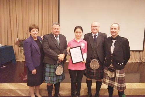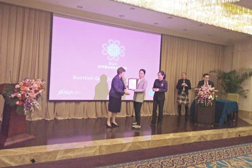 苏格兰学历管理委员会总裁珍妮特·布朗博士和中国留学部服务中心国际合作处处长张海霞女士为我校黄愿雅同学颁发证书,拍照留念。