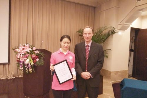 ▲珍妮特·布朗博士和张海霞女士为黄愿雅颁奖
