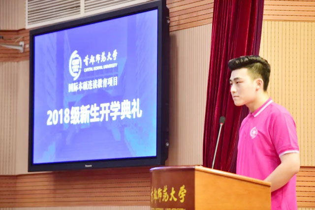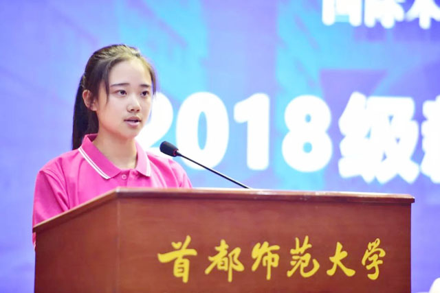 2018级新生李骁驰同学作为新生代表上台发言。她说进到美丽的校园,放眼望去,整齐的教学楼,宽敞明亮的教室,优美的校园环境,无不展示了首师大独一无二的国际化资源,这一切无不昭示着:来到这里,是我们正确的选择!她代表全体新生表示:新的学年我们要以饱满的精神姿态迎接新的机遇和挑战,希望每一位同学都能以自己的勤奋与智慧书写新学期的满意答卷!
