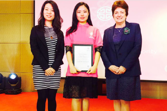 2017年"SQA AD理想大使"颁奖典礼3月21日在北京北辰洲际酒店隆重举行,来自全国各地的SQA AD项目中心师生代表参加了典礼。中央财经大学外国语学院2015级SQA AD项目学生陈文君获此殊荣。