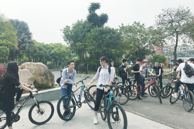 按照计划,4月7日下午一点三十分同学们在校区教学楼一楼集中,由班干部组织集体前往大夫山北门。首先大家骑上了公园门口租来的自行车绕湖骑行一圈,欣赏美丽的风景,沿路欢声笑语不停,同学们都陶醉在春日里宜人的自然风光中。除了绿荫下整齐的绿道,大夫山公园内大小不一的自然湖泊和人工湖也是一大亮点。集体绿道骑行一个多小时后同学们自由活动,商科班活泼的女生们就早早地发现了湖边的租船点,告知了班主任后,便前往租船点泛舟游湖。爱探险的男生们也不示弱,不多时也得意地回来炫耀了“新发现”,原来公园尽头的一大片绿地上聚集了一大群风筝高手,千奇百怪的风筝正在高空中争奇斗艳。