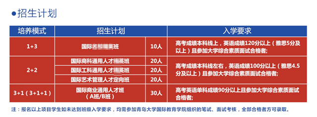 为了引进国外优质教育资源,培养国内急需的商业技能型和高端商务人才,促进中英、中澳两国的教育合作与交流,青岛大学出国留学培训基地通过引进英澳两国大学的课程体系、评价标准和教学模式,与国内优质教育资源相结合,为广大高中毕业生推出了3+1(3+1+1)项目。该项目课程涵盖英语语言课程和国外大学专业课程,在青岛大学学习3年后,毕业生将具备熟练的英语应用技能,并掌握相关专业的国际化、前沿的知识和技能,成绩合格并达到国外大学的录取要求者,可以赴国外大学继续学习2年获得本科和硕士学位,部分优良学生国外续本后又进入牛津大学、华威大学等世界茗校攻读硕士学位。该项目为广大高中毕业生及同等学历者,提供了在国内接受国外优质教育资源教育的机会,为学生和家长节省了昂贵的留学费用。